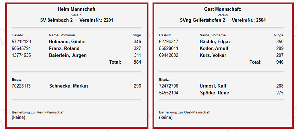 Die zweite Mannschaft um Mannschaftsführer Rene Spörke musste sich Beimbach 2 auf deren heimischen Stand stellen und unterlag mit 946 zu 984 Ringen.