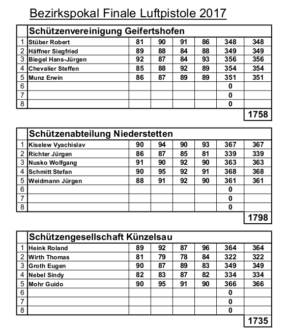 Am Freitag den 23.3.2018 fand die "diesjährige" Endrunde im Luftpistolen Bezirkspokal in Niederstetten statt. Von Geifertshofen gingen die Schützen Siegfried Häffner, Erwin Munz, Steffen Chevalier, Robert (The Rob) Stüber und H.J.-Biegel an den Start. Mit einem Ergebnis von 1758 Ringen konnte man sich gegen die Schützengesellschaft Künzelsau (1735) auf den zweiten Platz durchsetzten. Den ersten Platz sicherte sich mit insgesamt 1798 Ringen die Schützenabteilung Niederstetten.