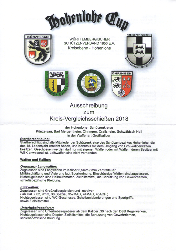 Die Termine zum diesjährigen Hohenlohe Cup stehen fest. Am 1.7.2018 in Altenmünster, am 8.7.2018 in Laudenbach und am 15.7.2018 in Mulfingen findet jeweils von 10-15 Uhr das diesjäjhrige Kreisvergleichsschießen in diversen Großkaliberdisziplinen statt.